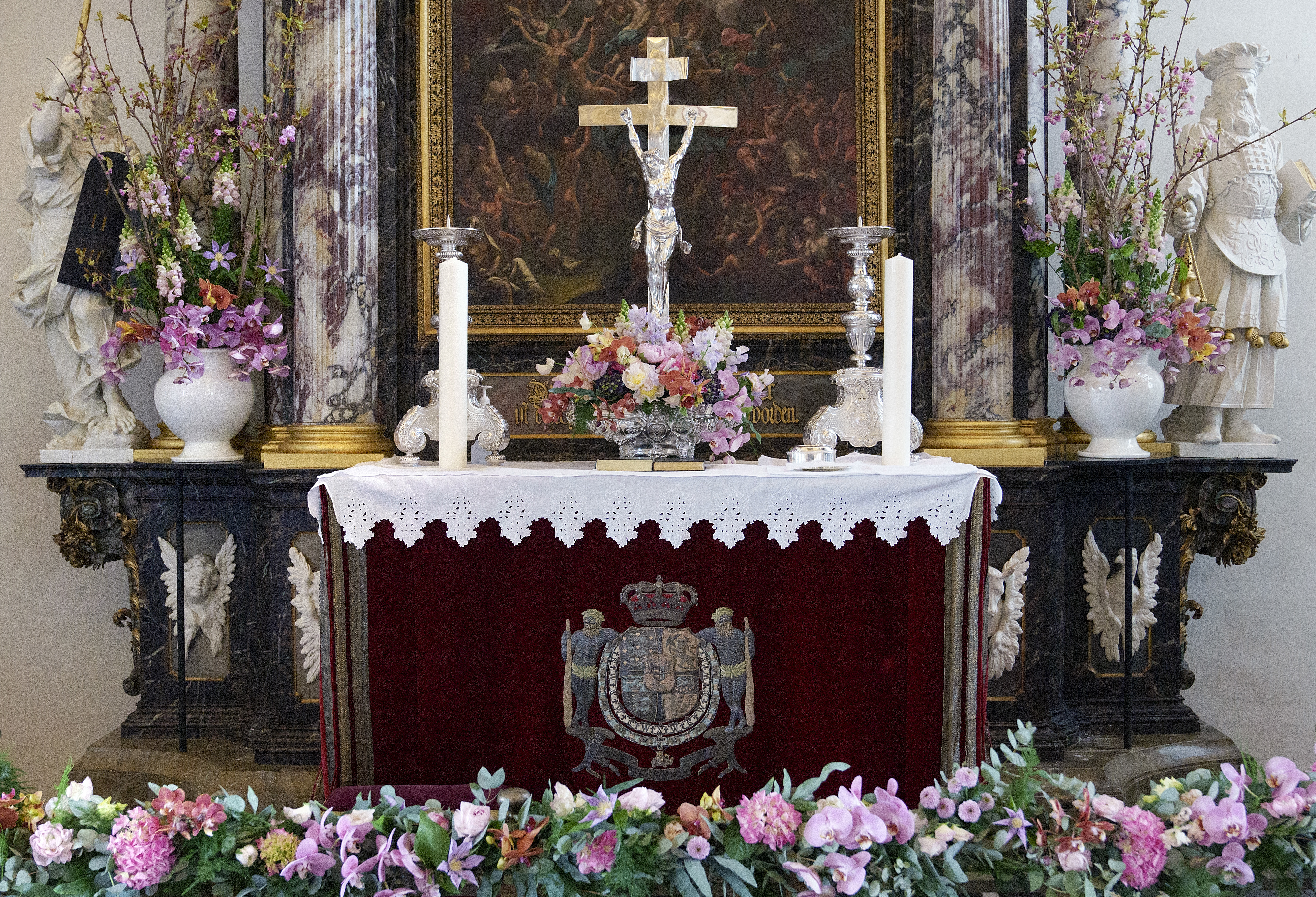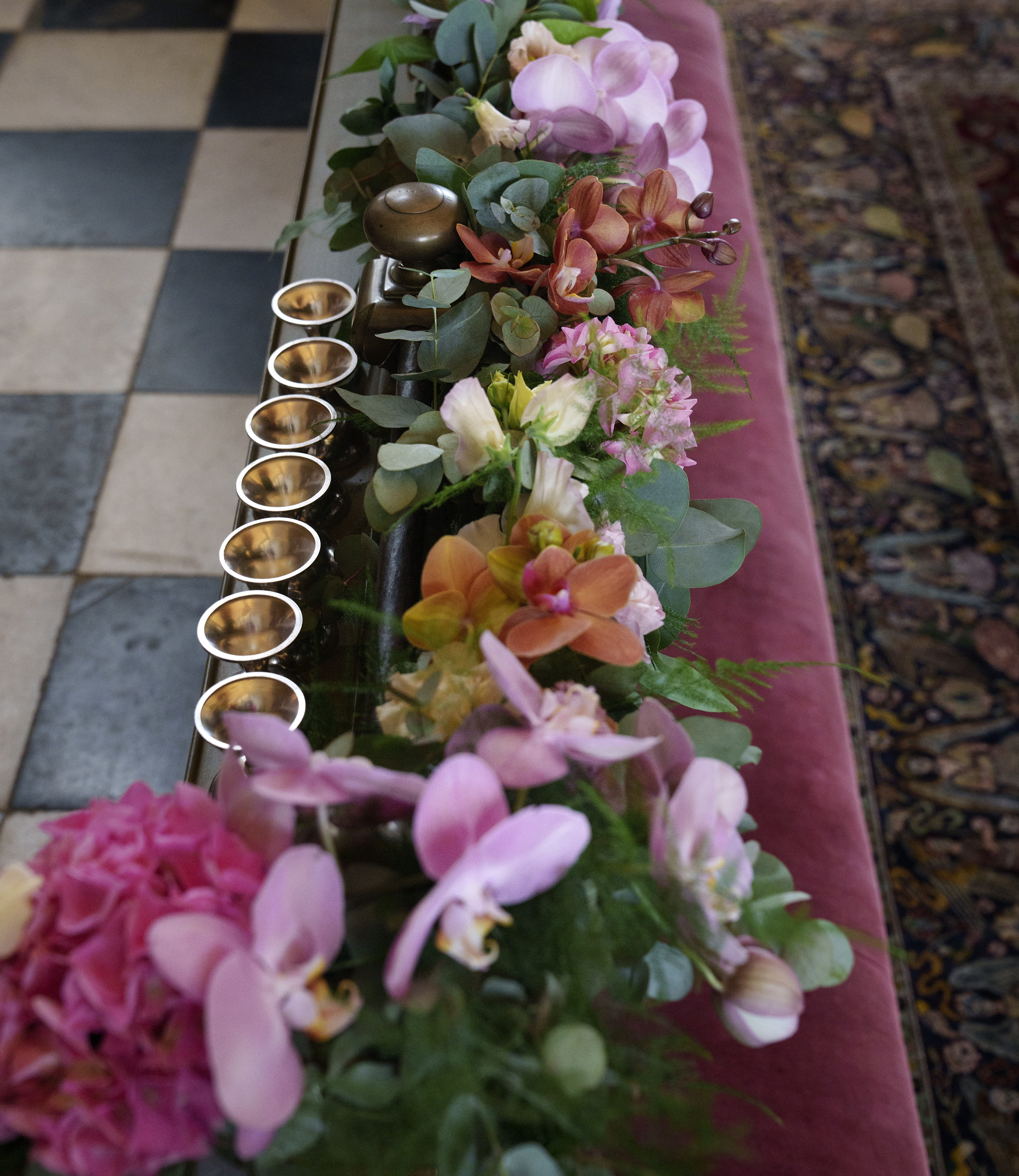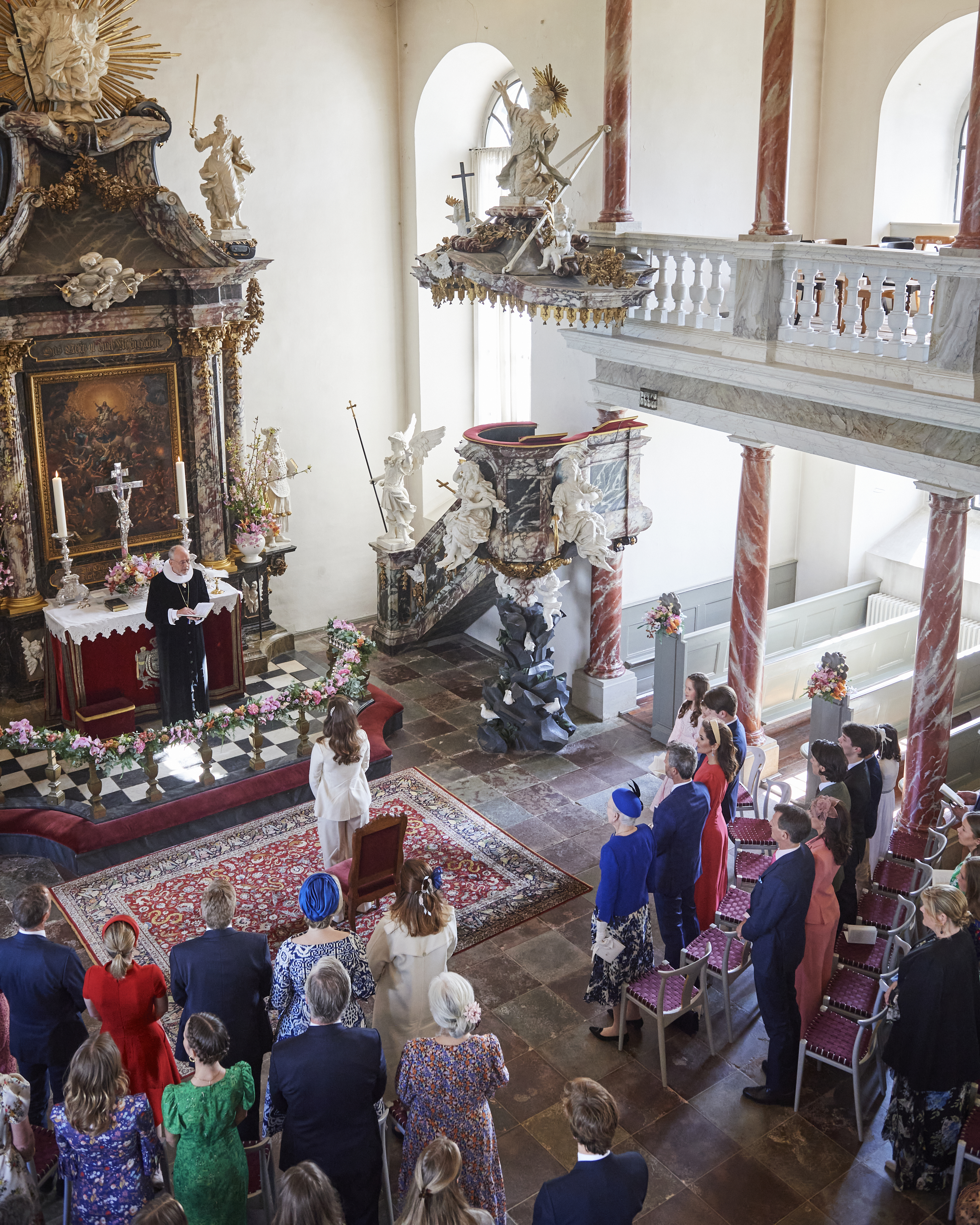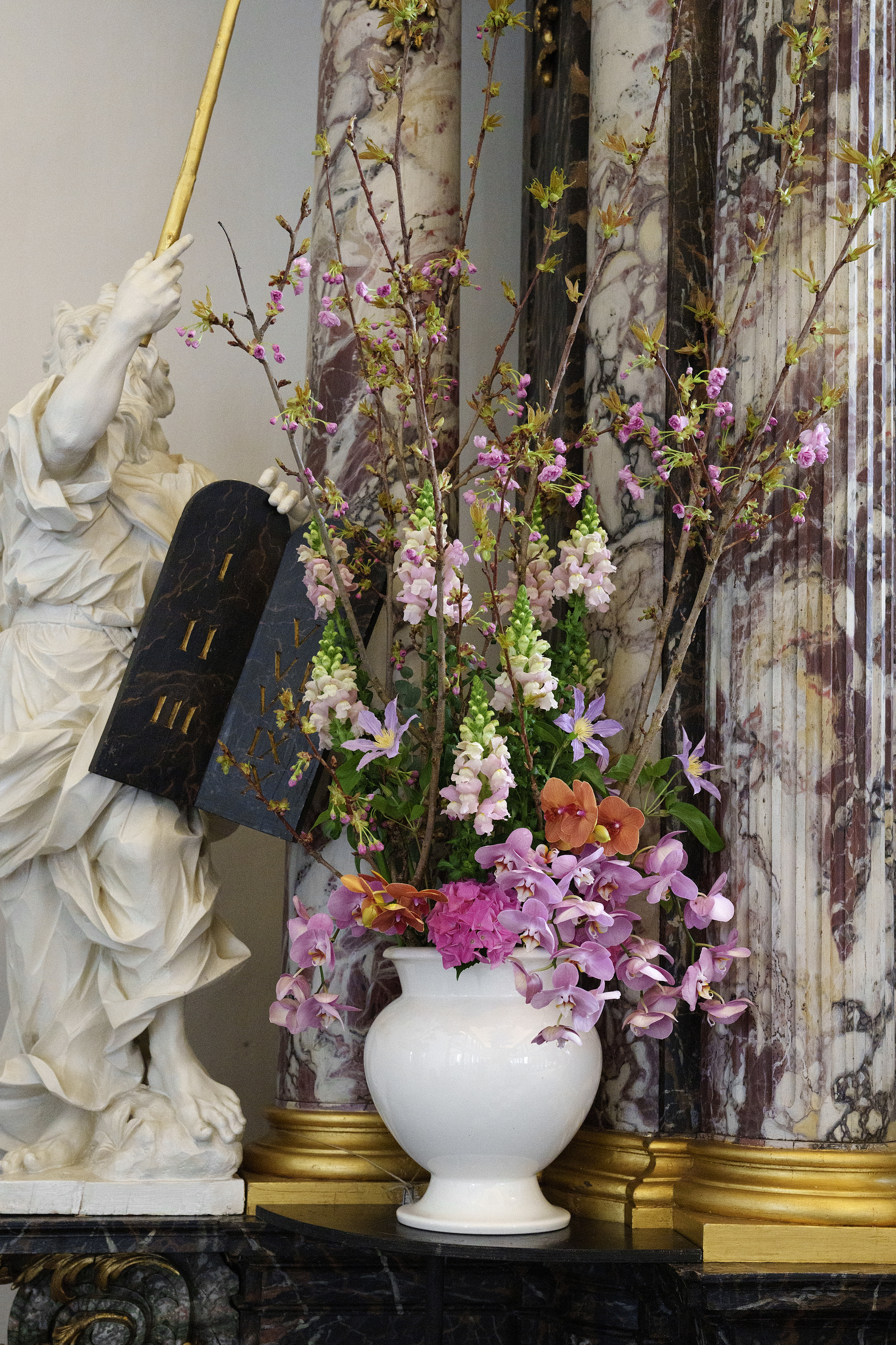 По случаю конфирмации Дворцовая Церковь Фреденсборга украшена цветочными композициями, создающими ощущение весны с пастельными оттенками светло-фиолетового, розового и кремового цветов.
