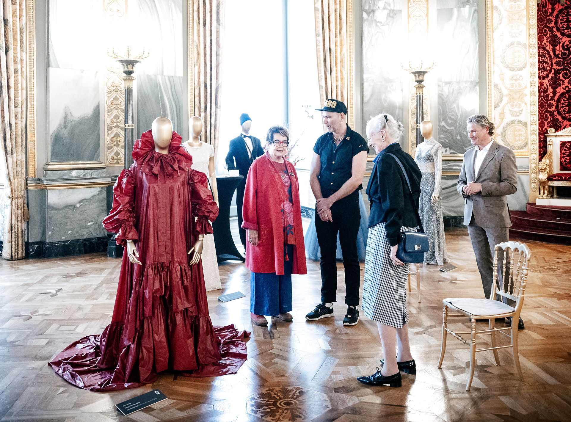 В Тронном Зале актриса Гита Нёрби и дизайнер Николас Нюбро рассказали Ее Величеству о красном платье, которое Гита Нёрби носила на балу в Замке Кристиансборг в 2016 году.