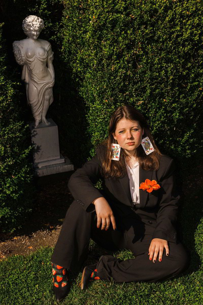 Пара игральных карт свисает с ее ушей. Она нарисовала несколько звезд на своем лице.